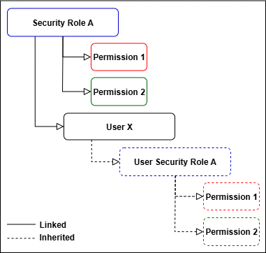 When security role is linked to a user, a unique user security role is created. The permissions that are linked to the security role are inherited to the user security role. In the example below, User X is linked to Security Role A to create User Security Role A. Permission 1 and Permission 2 are inherited to User X.