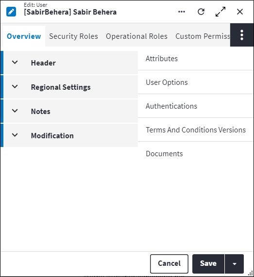 Data is captured on the following tab(s) of the edit screen: Overview, Security Roles, Operational Roles, Custom Permissions, Attributes, User Options, Authentications, Terms and Conditions Versions and Documents. Below is a list of descriptions for the fields in the sections on each tab.